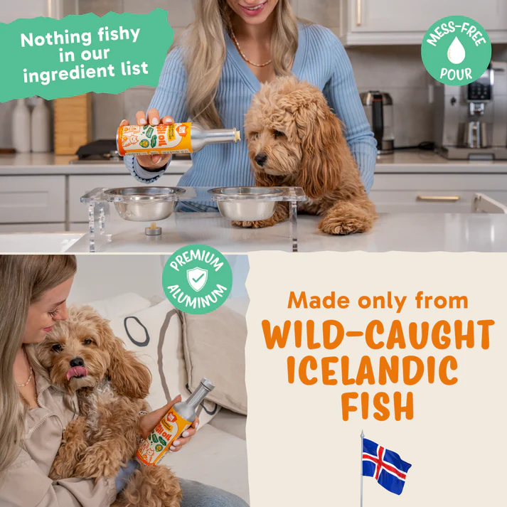 Give your pet premium omega-3 nutrition from wild-caught Icelandic fish. Our fish oil combines wild-caught cod, anchovy, mackerel, herring, and sardine oils, naturally rich in EPA and DHA fatty acids for healthy skin and coat, immune system, joint and heart.