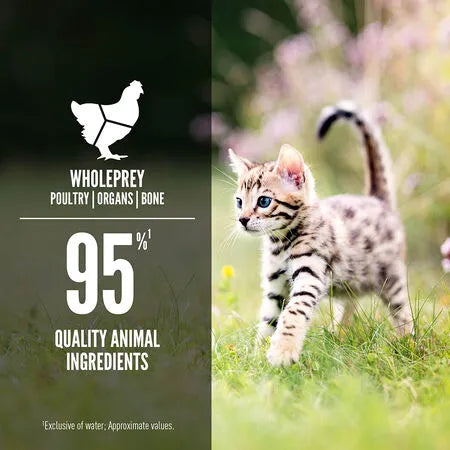 - Our authentic WholePrey diet features the most succulent and nutrient-rich parts of the prey including poultry or fish, organs and bone to mimic what your kitten’s ancestors consumed in the wild.