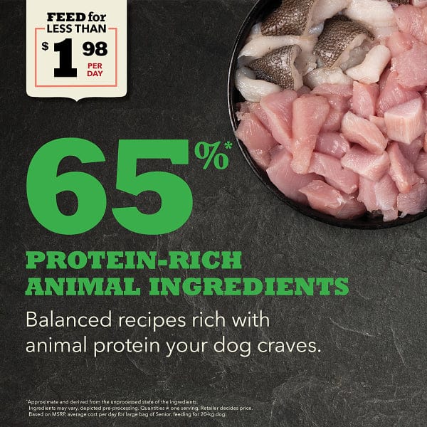 When it comes to ACANA™ food for dogs, we’re obsessed with every ingredient that goes into our premium recipes made right here in Canada. That’s why our Senior Recipe is thoughtfully crafted to nurture senior dogs of all breeds with balanced nutrition and fewer calories. Made with 65%2 quality animal ingredients like fresh free-run1 chicken and raw hake balanced with 35% fruit and vegetables3 like fresh whole pumpkin, greens, apples and pears, this recipe provides the nutrition and animal protein your senior dog needs to live their best life. These wholesome ingredients are provided by suppliers we know and trust, and our vets and pet nutrition experts carefully craft each recipe with the goal of making your pet feel so good inside, you’ll see it on the outside.