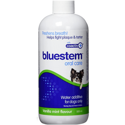 Bluestem Vanilla Mint Flavour Water Additive Oral Care for Dogs helps to freshens breath, fight plaque & tartar! Scientifically formulated and clinically proven to maintain good oral hygiene by attacking periodontal disease. It helps prevent plaque, breaks apart tartar, and also freshens breath!