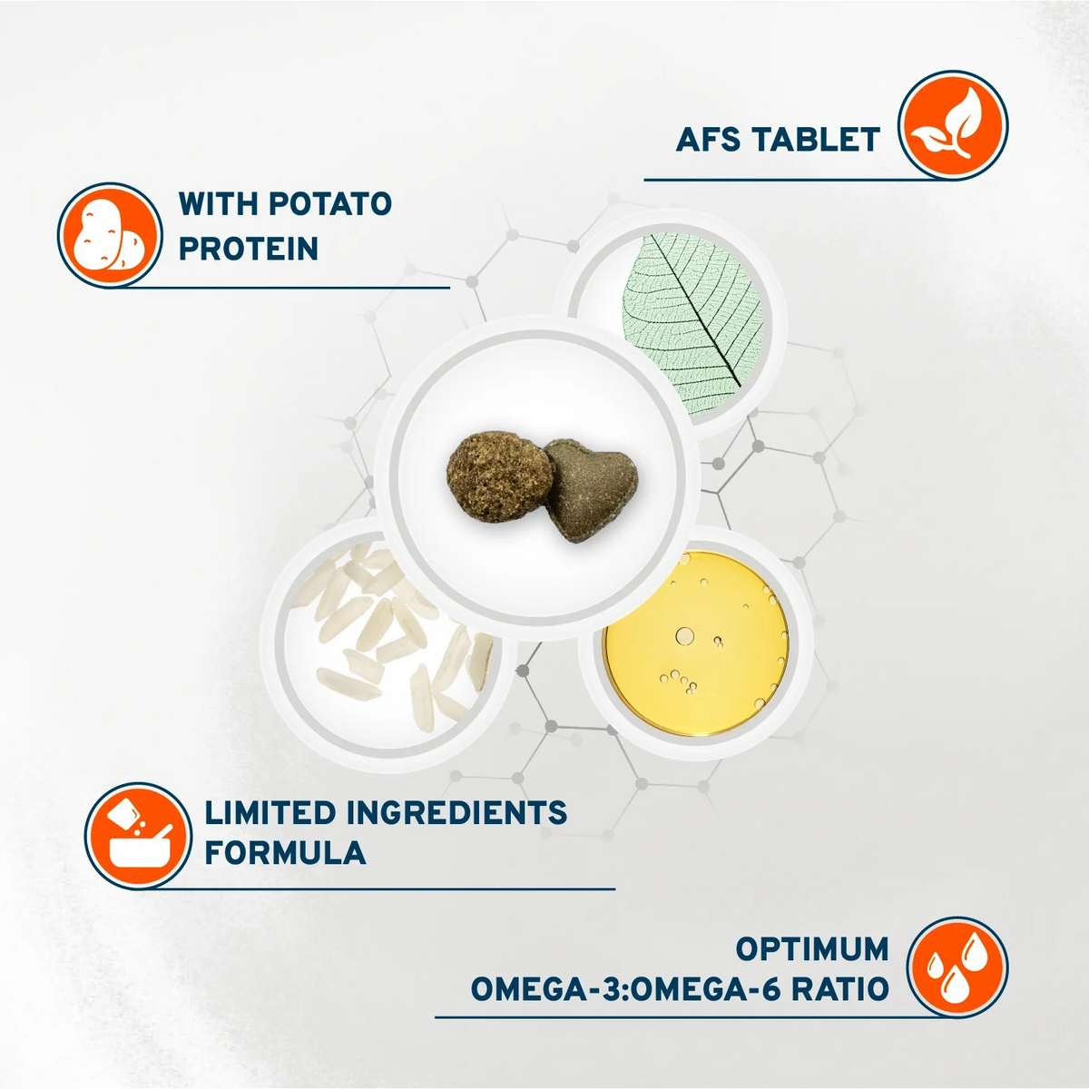 Milled rice, oils and fats (of which fish oil 2%), potato protein, ((AFS tablet – 7% of the food): potato protein, hydrolyzed fish protein, mouse-ear hawkweed, products from the processing of herbs (Lespedeza spp.), dried fruit pomace (Vaccinium macrocarpon), bearberry leaves)), dehydrated fish, rice middlings, beet pulp, hydrolyzed fish protein, hydrolyzed poultry protein, dried algae (Ascophyllum nodosum), mannan oligosaccharides (MOS), fructo-oligosaccharides (FOS), Yucca schidigera, vitamin A, vitamin E, vitamin B1, vitamin B2, vitamin B6, vitamin B12, vitamin PP, calcium D-pantothenate, folic acid, choline chloride, ferrous sulphate monohydrate, zinc sulphate monohydrate, zinc chelate of amino acids hydrate, copper(II) chelate of amino acids hydrate, copper(II) sulphate pentahydrate, manganese oxide, sodium selenite, taurine, clinoptilolite of sedimentary origin, tocopherol extract from vegetable oils, Dandelion, Rosemary.