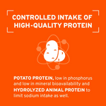 • Formulated with Hydrolyzed Protein and potato protein: controlled Phosphorus and adapted protein content.