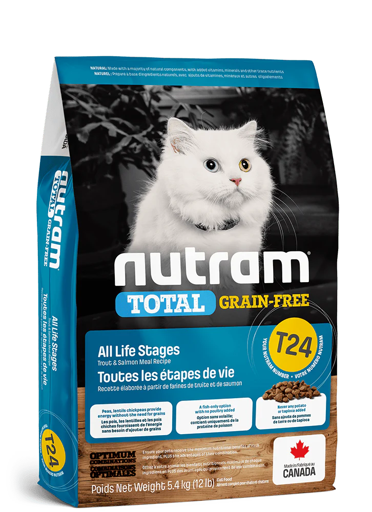 T24 Nutram Total Grain-Free® Trout and Salmon Meal Recipe Cat Food is a Holistic, multi-beneficial, and nutrient-rich recipe that improves your pet’s wellness from the inside-out. Our Holistic approach starts with wholesome ingredients you can pronounce, such as a blend of low-glycemic Peas, Lentils and Chickpeas as a source of healthy carbs and quality protein. This, combined with a blend of Turmeric, a source of curcumin, and Salmon Oil, rich in Omega-3 fatty acids, provide immune boosting properties to help support a strong immune system. Nutram's Optimum Combinations™ goes further and offers Cranberries, a natural acidifier, and Celery Seeds, an effective diuretic, to help maintain healthy fluid levels, working together with proper pH and moderate ash levels to support a healthy bladder. You can be confident that your pet’s food is healing, wholesome and part of a total wellness lifestyle.