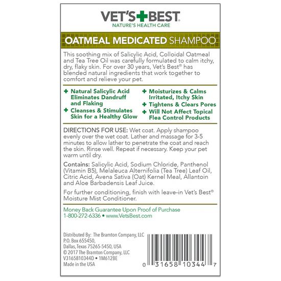 Calm and moisturize itchy, dry, flaky skin with Vet's Best Oatmeal Medicated Dog Shampoo. Our veterinarian-formulated shampoo is a soothing mix of salicylic acid and key natural ingredients (including colloidal oatmeal, tea tree oil, and vitamin B5) that eliminates dandruff and flaking; clears and tightens pores; and cleans and stimulates your dog’s skin for a healthy glow. Will not affect topical flea and tick control products.