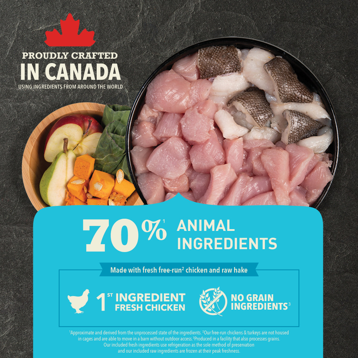 When it comes to ACANA™ food for dogs, we’re obsessed with every ingredient that goes into our premium recipes made right here in Canada. That’s why our Small Breed Puppy Recipe is thoughtfully crafted with ingredients that help nurture your small breed puppy’s growth and development. Made with 70%1 quality animal ingredients like fresh free-run2chicken and raw hake balanced with 30% fruit and vegetables3 like fresh whole pumpkin, greens, apples and pears, this recipe provides the nutrition and animal protein your puppy needs to live their best life. These wholesome ingredients are provided by suppliers we know and trust, and our vets and pet nutrition experts carefully craft each recipe with the goal of making your pet feel so good inside, you’ll see it on the outside.